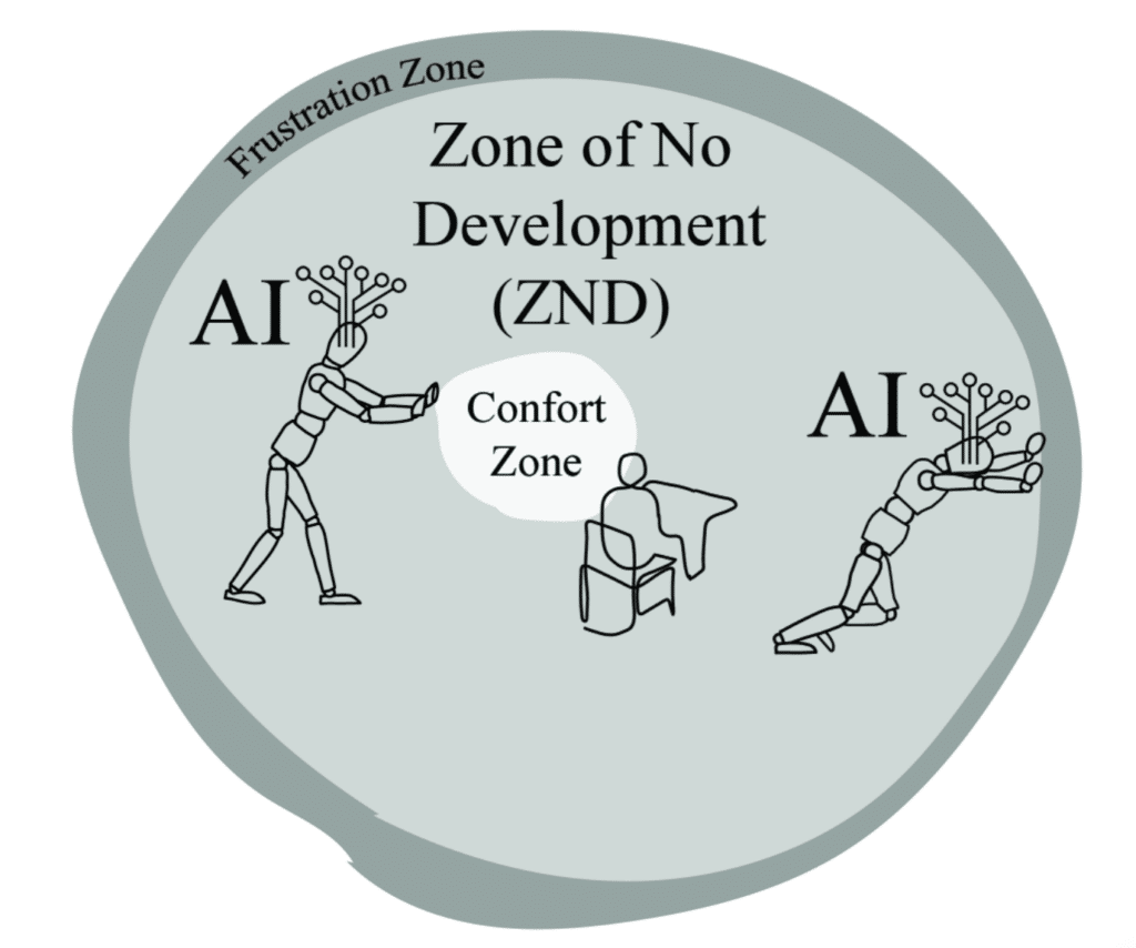 The authors describe this worrying state as the Zone of No Development (ZND), a space where assistance replaces challenge and cognitive growth stalls. Constant digital support can create an illusion of learning, with high performance in the moment but shallow retention and limited capacity for creative application later. The paper reminds us that struggle is not a sign of failure but a fundamental part of learning.